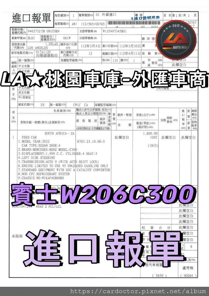 LA桃園車庫-外匯車商W206C300進口報單.jpg