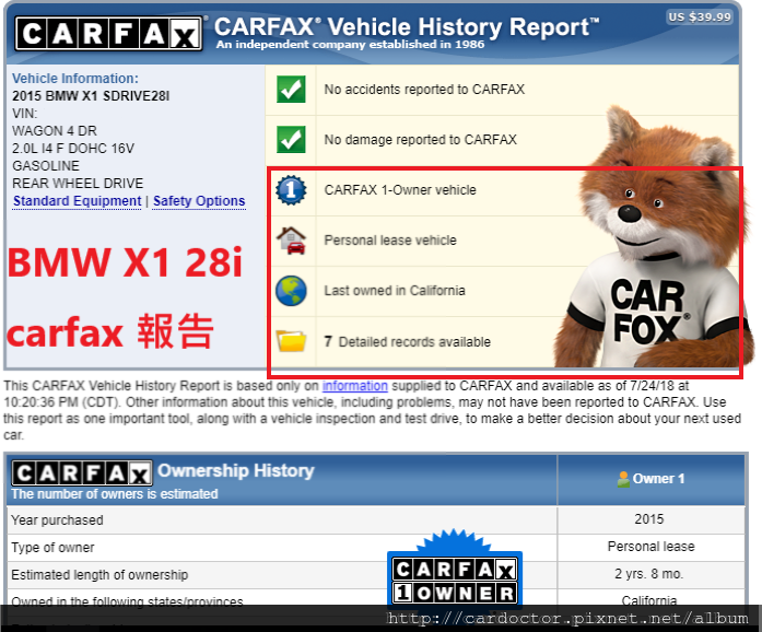 在買車前我們都會幫客戶檢查Carfax及Autocheck報告,像這台BMW X1外匯車在美國只有一任車主,CPO原廠認證,車況相當的好,是台CP值很高的車。