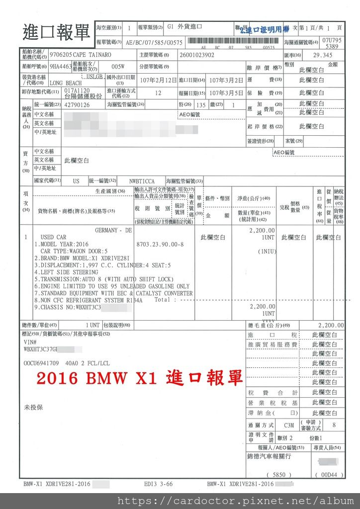上圖是LA桃園車庫進口 BMW X1外匯車的進口報單,每一部外匯車都是LA桃園車庫自辦第一手進口回台!